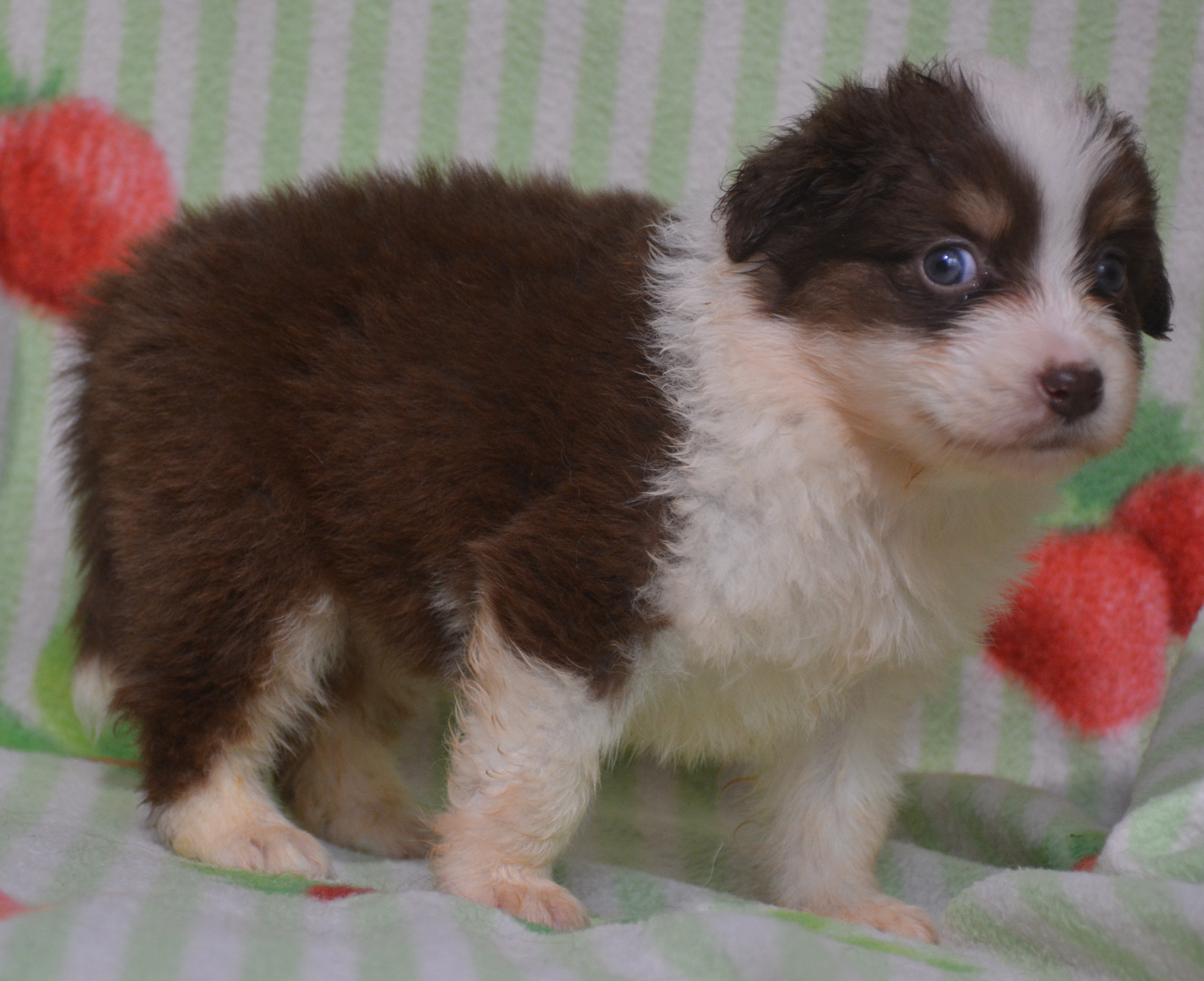 Femelle rouge tricolore, yeux bleus, très joli marquage, collier blanc complet, queue longue, excellente origine test ADN et TESTS génétiques liées à la race. Tous nos chiots sont élévés en famille.NOUS VOUS PROPOSONS UN SUIVI DE VOTRE LOULOU