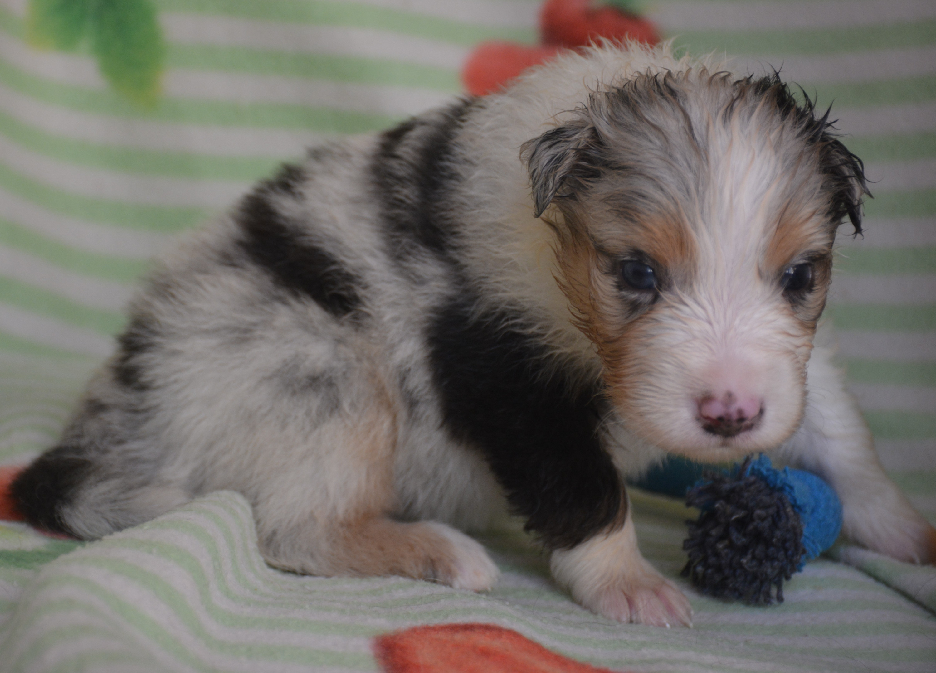 Mâle bleu merle, très joli marquage, collier blanc complet, queue courte,