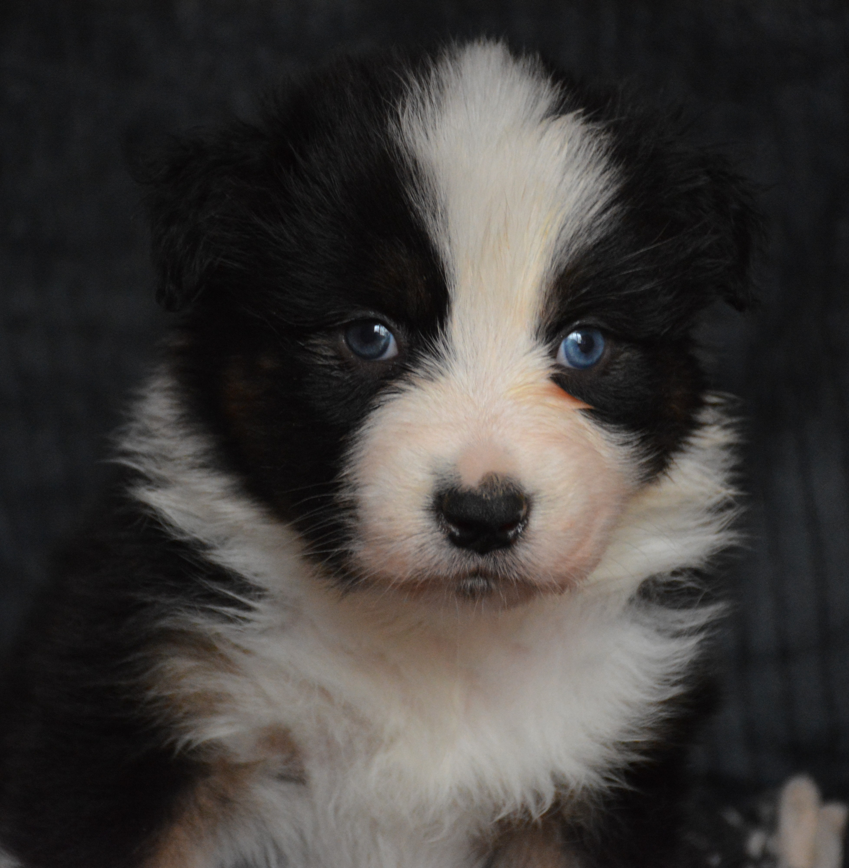 Femelle noir tricolore , yeux bleus , très joli marquage, collier blanc complet, queue courte ,