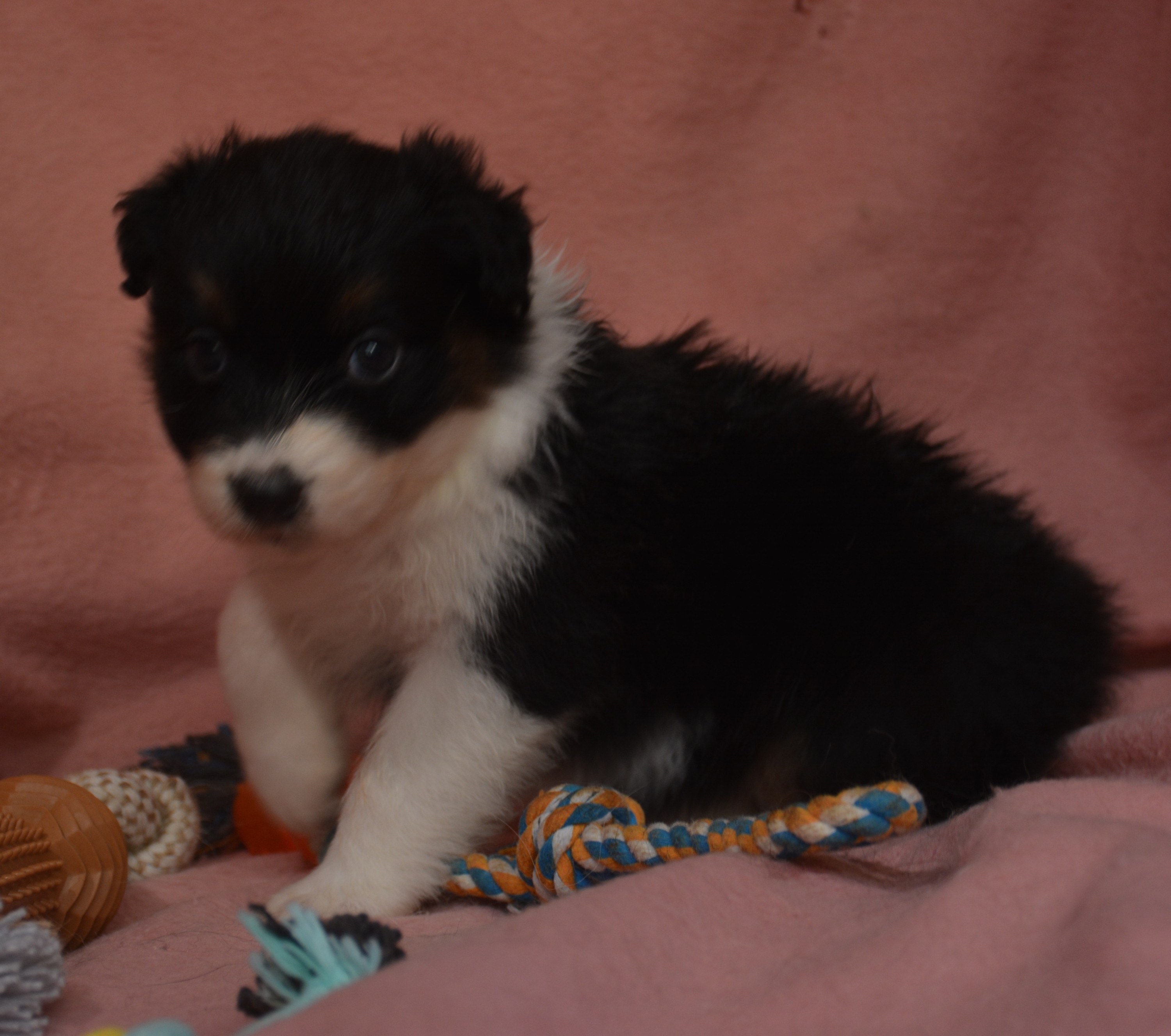 Femelle noire tricolore,très joli marquage,collier blanc complet,queue longue,excellente origine,test ADN ET TESTS génétiques liées à la race
