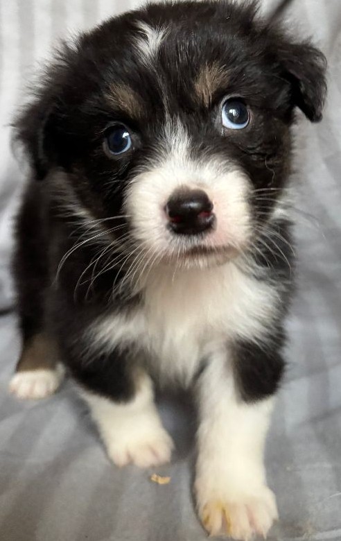 Mâle noir tricolore, yeux marrons, queue courte ,